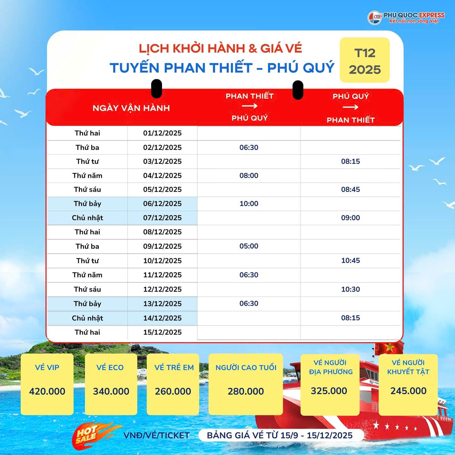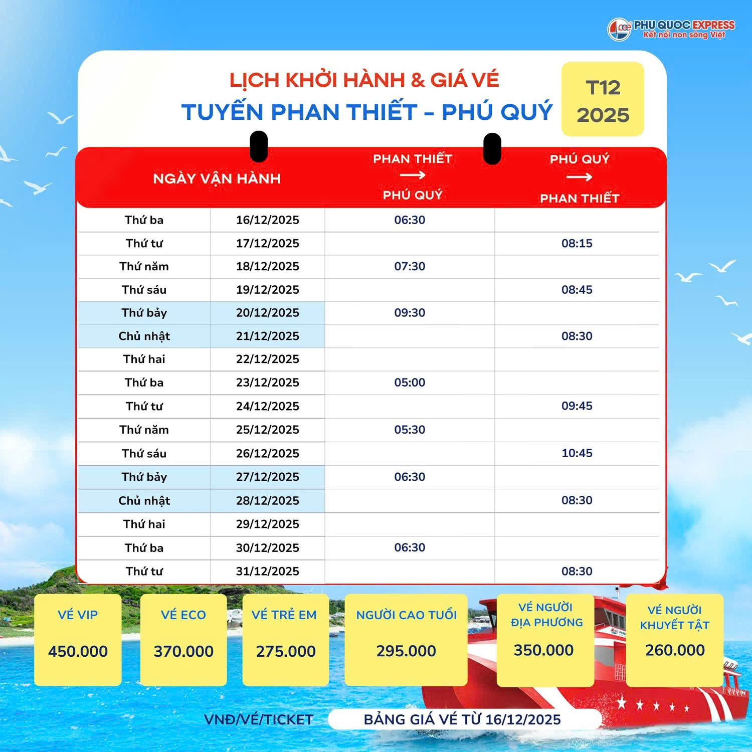 Tautrungtrac xin thông báo tới Quý khách hàng lịch chạy tàu Phan Thiết - Phú Quý 12/2025.